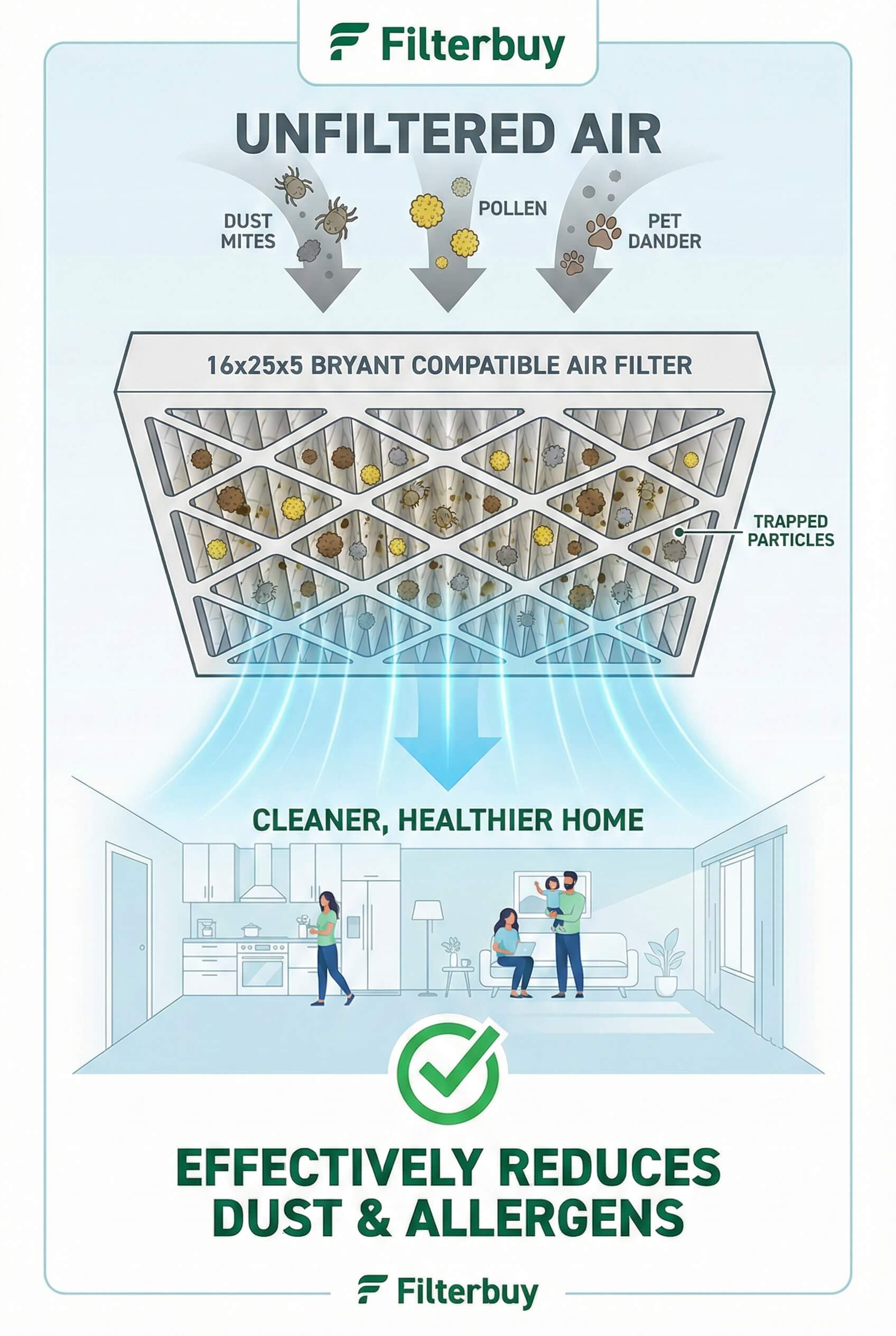 Stop letting dust and allergens compromise your family's comfort. Find your exact 16x25x5 Bryant replacement filter at Filterbuy—with free shipping, USA-made quality, and the perfect MERV rating for your household's needs.